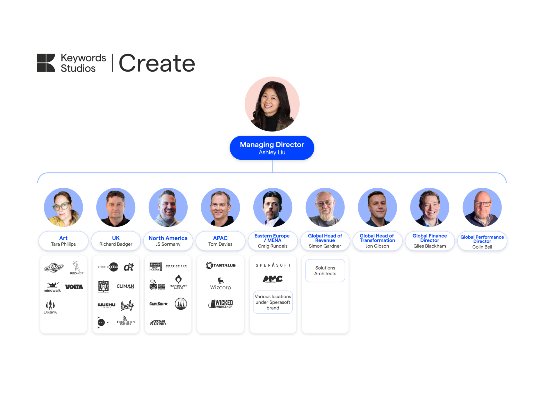 Keywords Studios Create - our game development and art division - is uniting studios and talent from across the group into a new regional structure that connects you more directly to our expertise, leadership, and creative talent. The result: easier access to the right teams, faster decision-making, and stronger partnerships - helping you Imagine More.